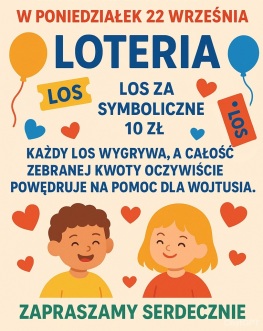Każdy los wygrywa, a całość zebranej kwoty oczywiście powędruje na pomoc dla Wojtusia. 💙Loteria odbędzie się na przerwach 😀 zapraszamy serdecznie