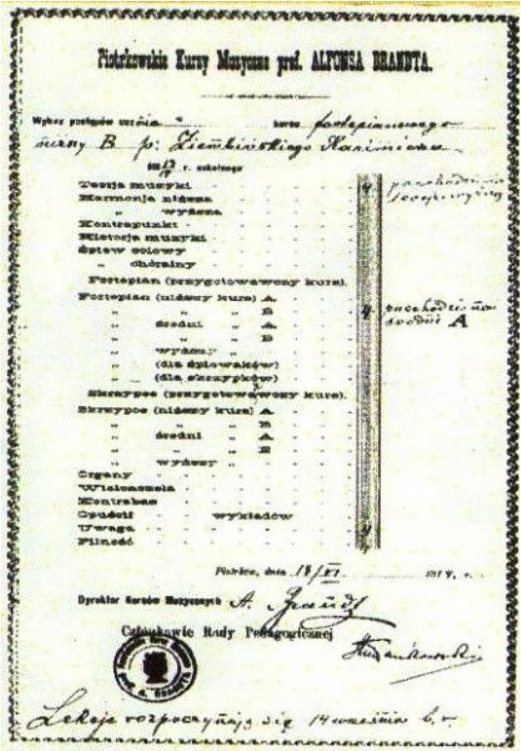 W 1911 roku uzyskał zgodę władz na zorganizowanie szkoły muzycznej, która funkcjonowała pod nazwą Piotrkowskie Kursy Muzyczne Alfonsa Brandta.